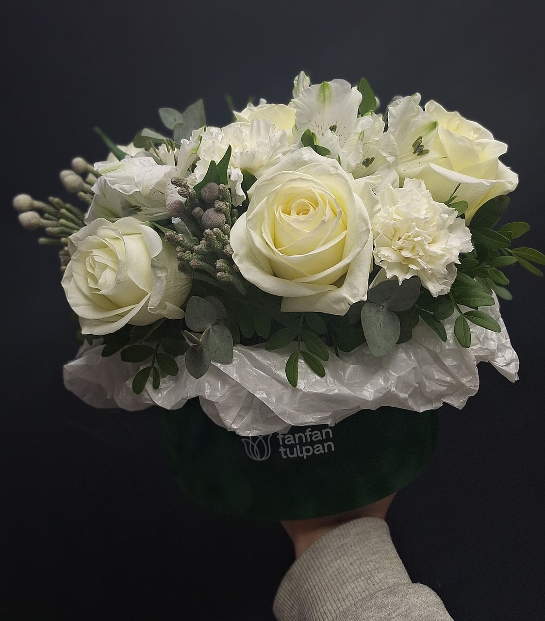 Данная цветочная композиция под запрос. Это значит что возможно у нас отсутствует какой-либо цветок в составе букета. Но мы готовы собрать похожую композицию, не чуть не менее красивую чем эта. Вы можете оставить заявку. И мы свяжемся с вами и предложим возможные варианты.