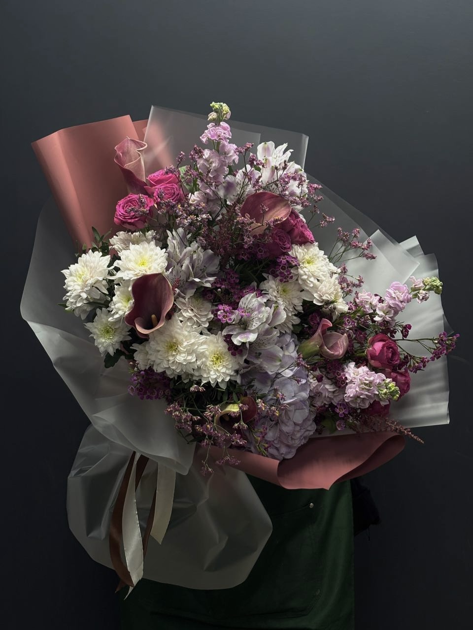 Данная цветочная композиция под запрос. Это значит что возможно у нас отсутствует какой-либо цветок в составе букета. Но мы готовы собрать похожую композицию, не чуть не менее красивую чем эта. Вы можете оставить заявку. И мы свяжемся с вами и предложим возможные варианты.