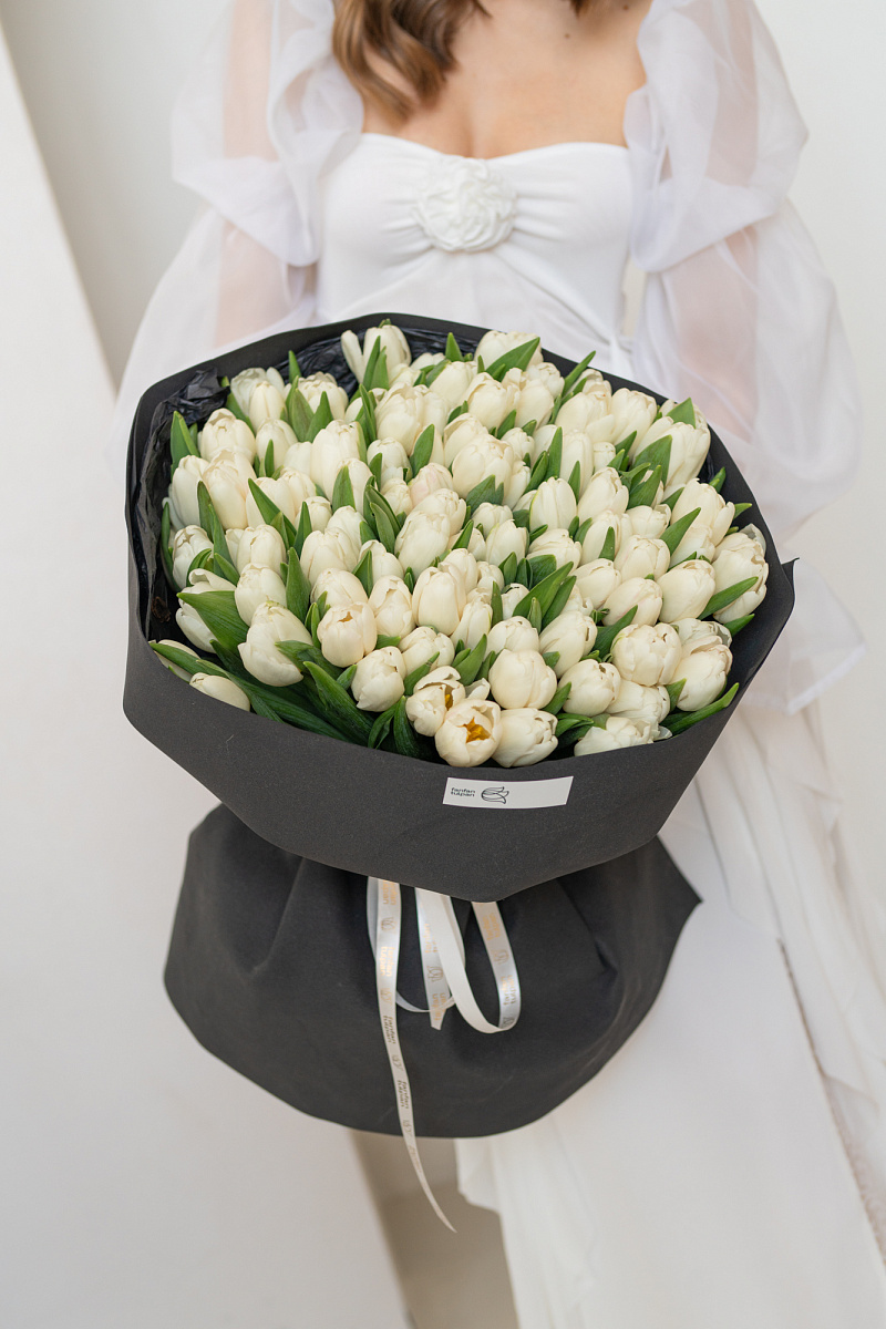 Актуальный дуэт: белоснежные тюльпаны и графичная чёрная упаковка. Контраст света и тени создаёт выразительный визуальный эффект, который органично впишется в современный интерьер. Такой букет станет запоминающимся подарком для тех, кто ценит нестандартные решения и эстетику контрастов.
