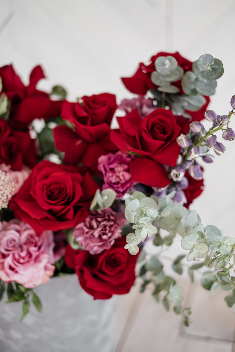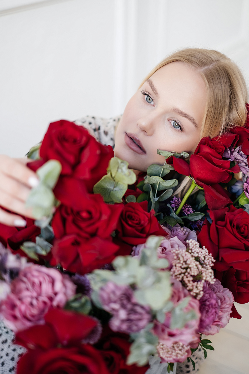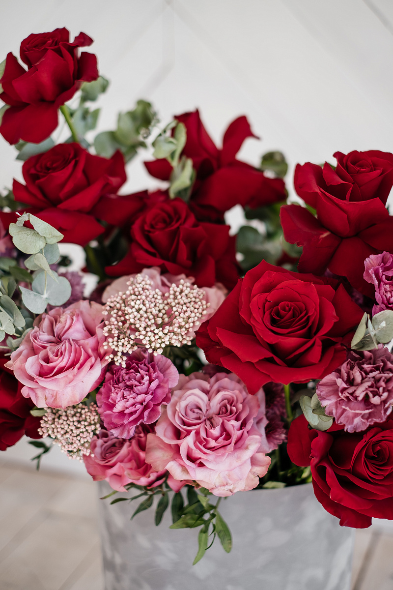 Роза кустовая ,Розы ,Дельфиниум ,гвоздика