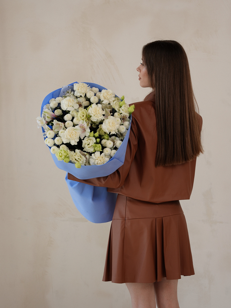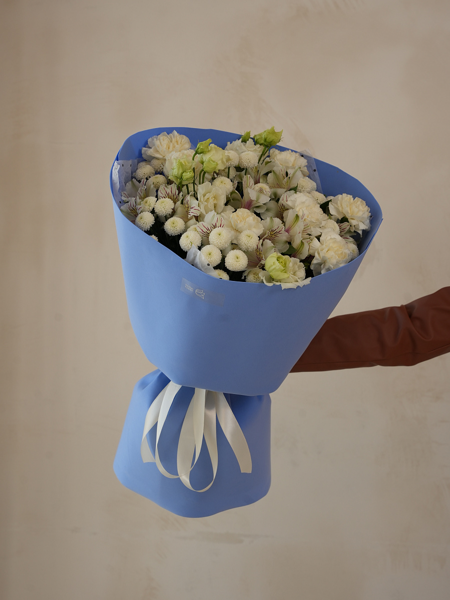 Сборный букет с белыми гвоздиками и пышной хризантемой символизирует чистоту, элегантность и тепло души. Белоснежные гвоздики источают аромат свежести и чистоты, словно первый снег зимой, подчеркивая изысканность и простоту одновременно. Хризантема добавляет объем и структуру композиции, обеспечивая контраст и глубину. Этот букет является универсальным вариантом для разных поводов: от поздравления коллег до особого внимания любимым людям. Прекрасно впишется в любой интерьер, подарив настроение радости и комфорта.