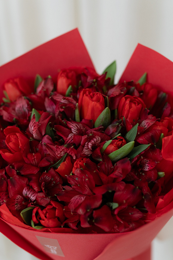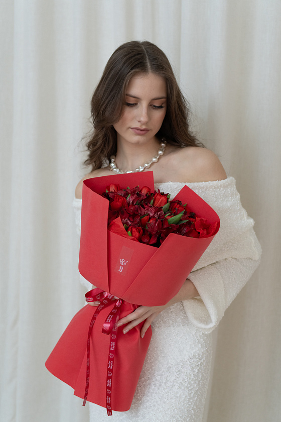 Букет из красных тюльпанов и альстромерий Гранатовый браслет