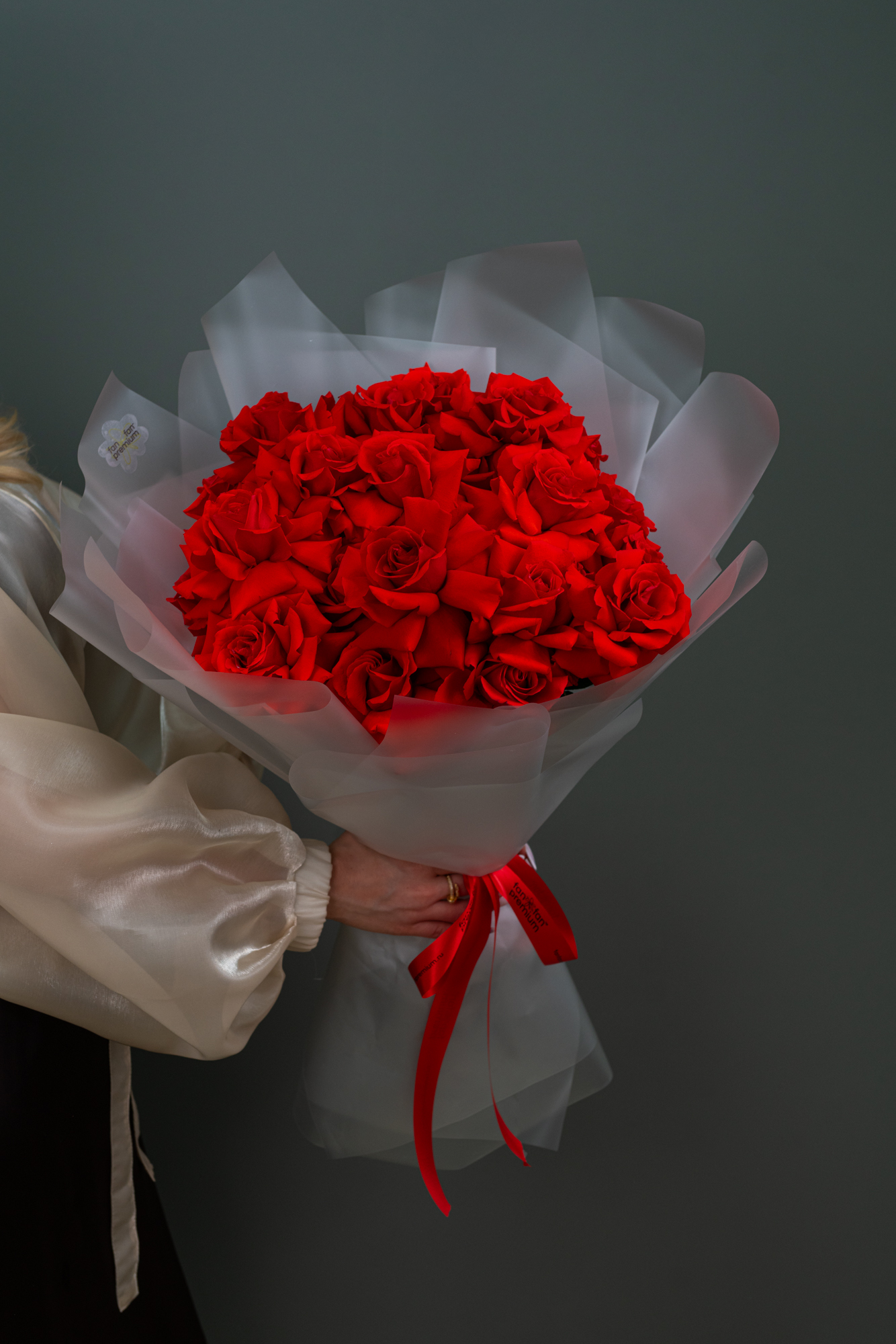Букет транспортируется с Аквабоксе и Коробке-Трапеции, либо в Аквабоксе и Фирменном пакете.