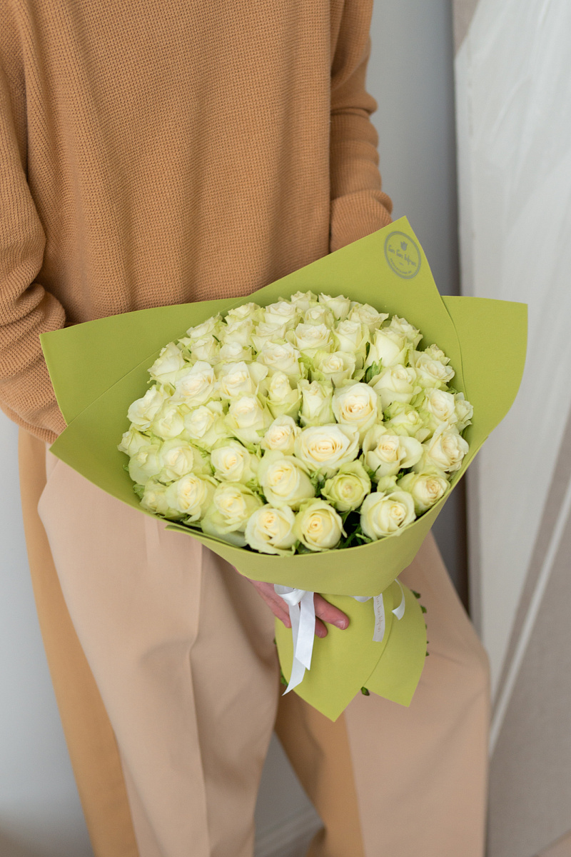 Букет доставляется в транспортировочном комплекте: "аквабокс + транспортировочная коробка-трапеция" или "аквабокс+фирменный пакет".