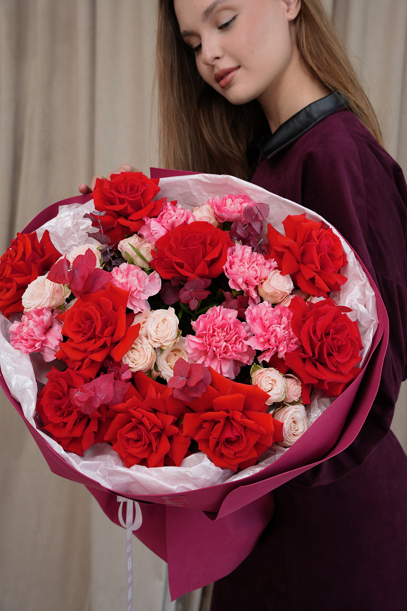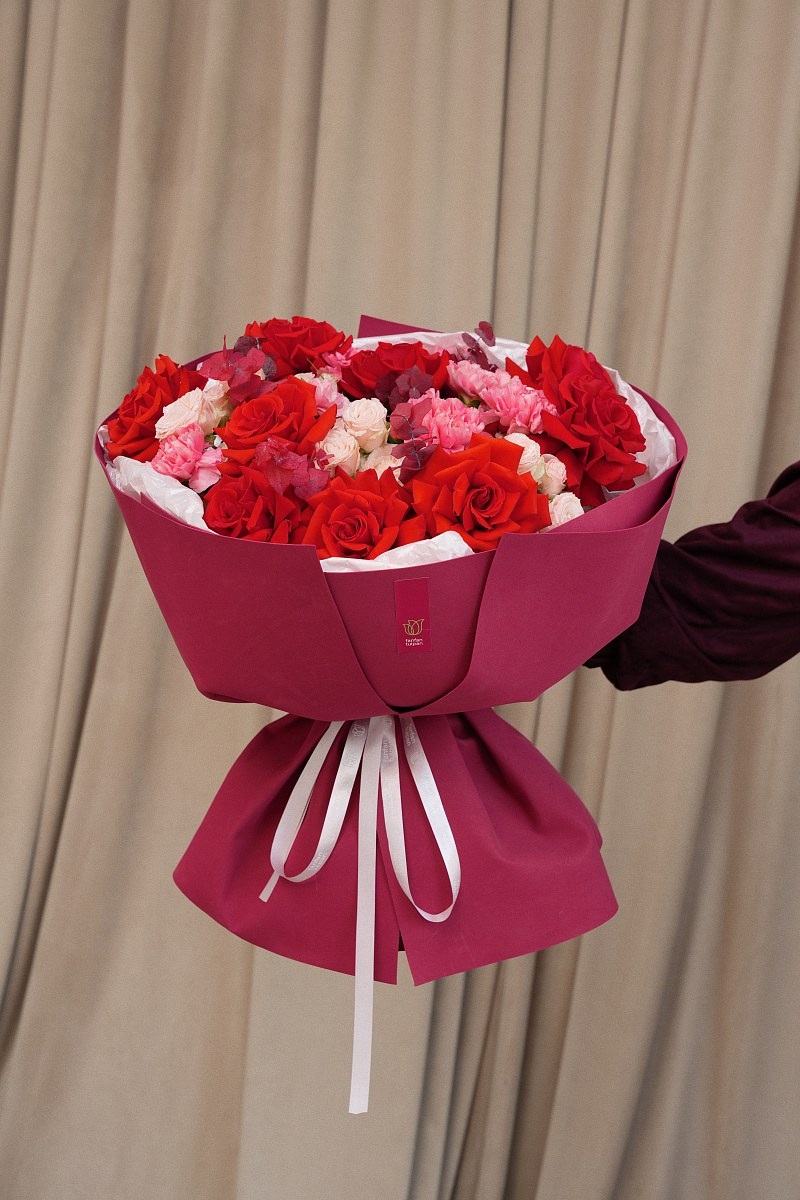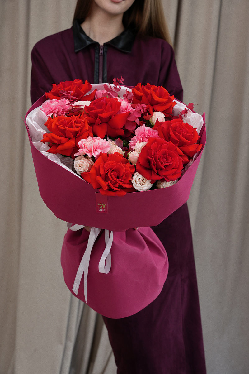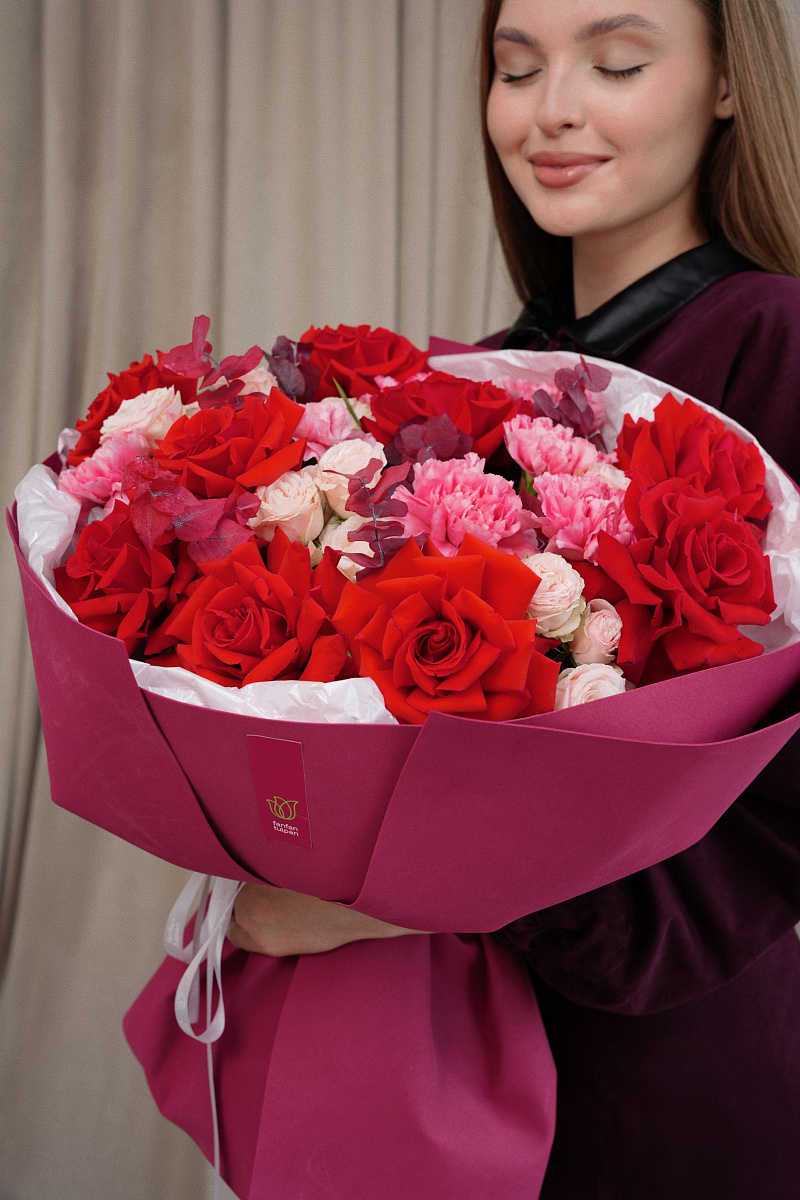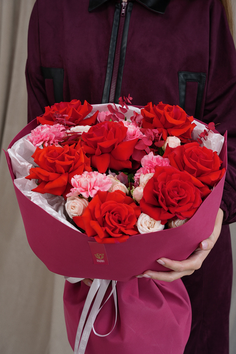 Букет в красно-бордовом цвете поражает своей насыщенностью и глубиной оттенков, представляя мощную палитру страсти и величественности. Ярко-красные цветы символизируют пылкое чувство и энергию, тогда как бордовые оттенки добавляют нотку аристократизма и загадочности.