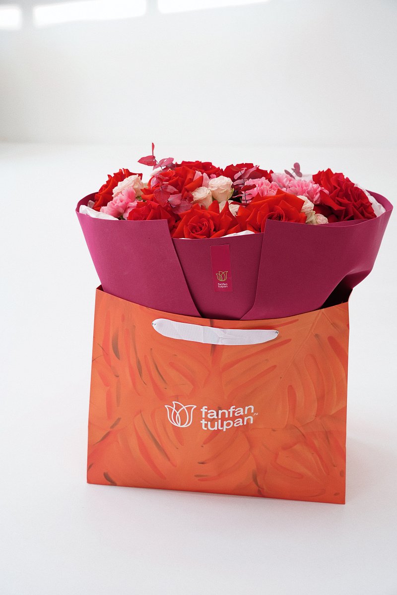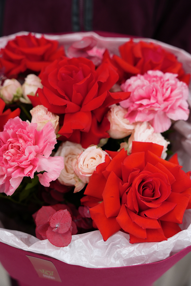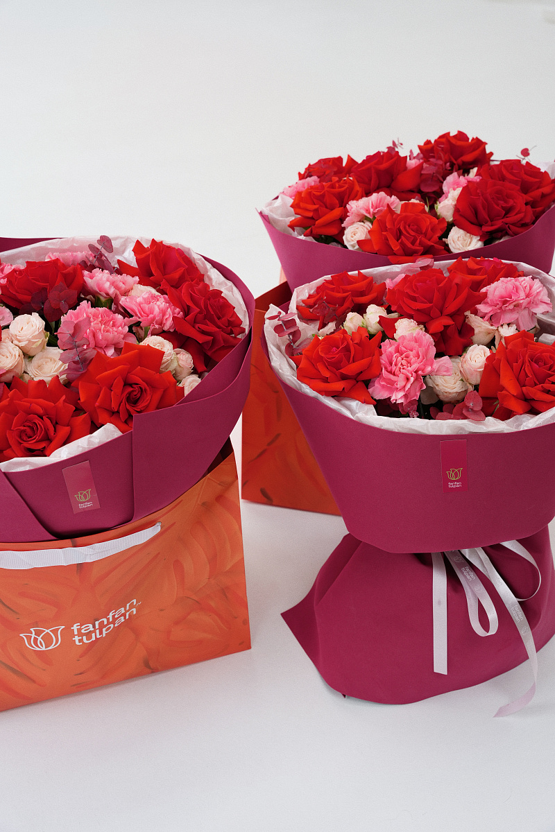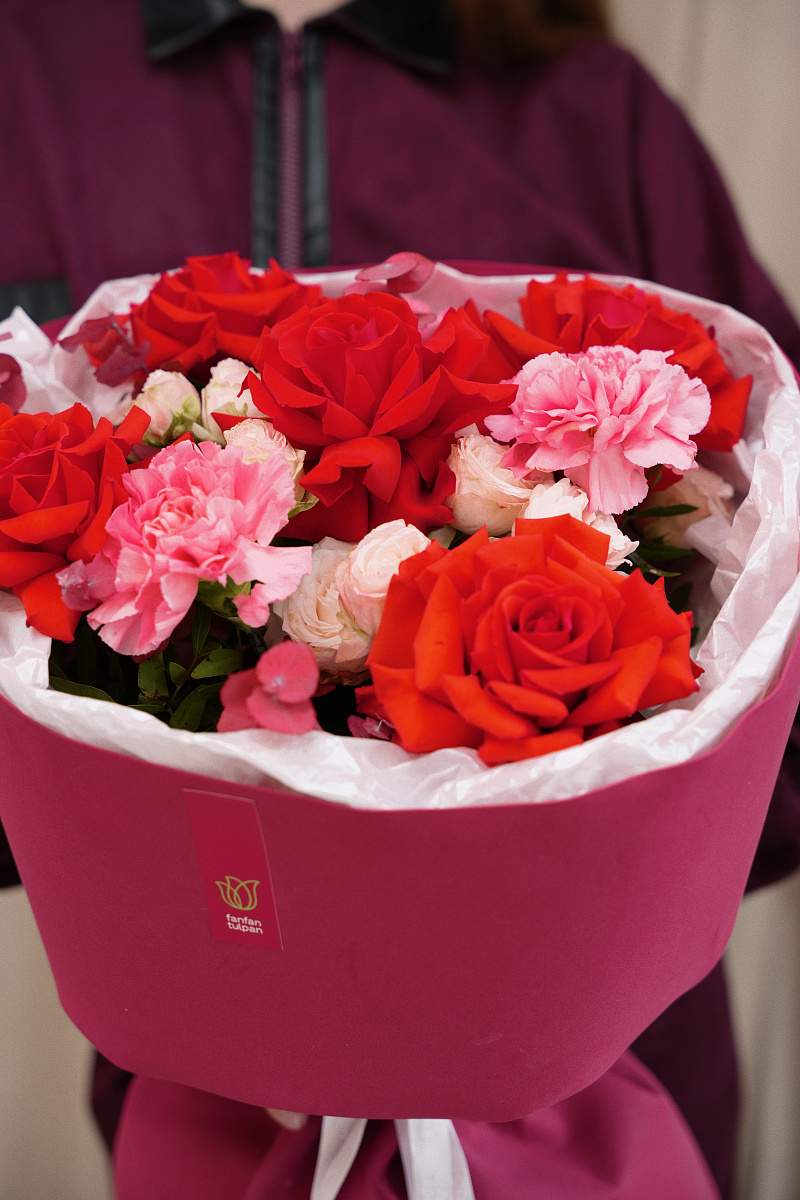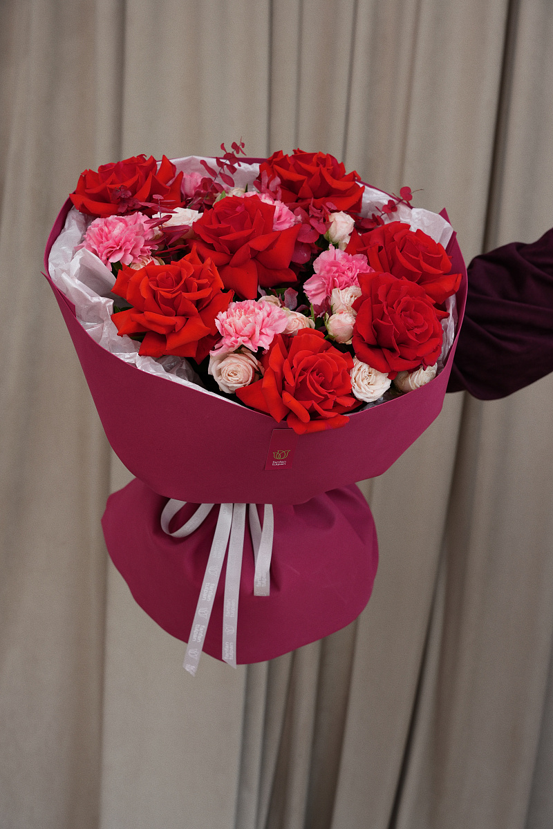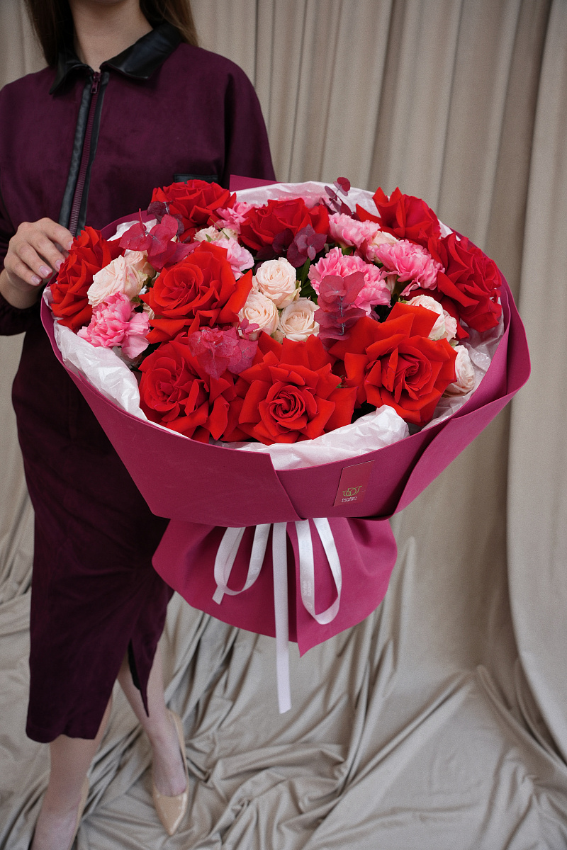 Букет в красно-бордовом цвете поражает своей насыщенностью и глубиной оттенков, представляя мощную палитру страсти и величественности. Ярко-красные цветы символизируют пылкое чувство и энергию, тогда как бордовые оттенки добавляют нотку аристократизма и загадочности.