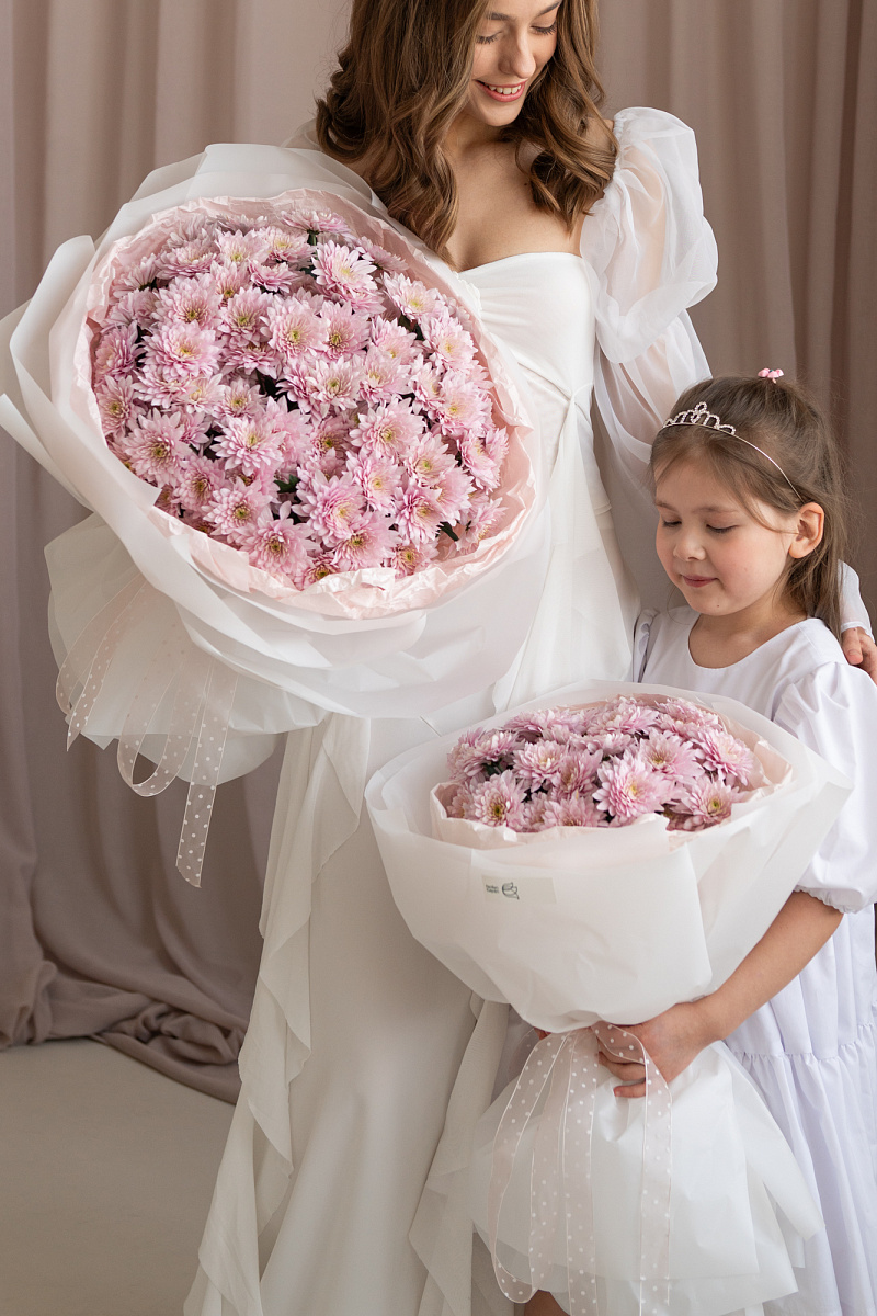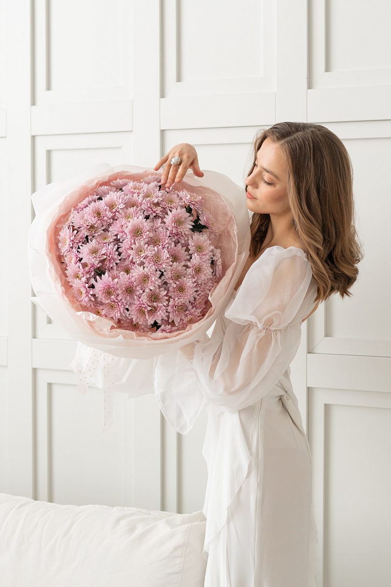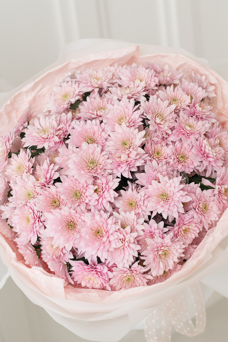 Изысканный букет из нежно‑розовых хризантем — воплощение утончённой красоты и благородства. Пышные соцветия с мягкими переливами оттенка создают ощущение невесомости и нежности. Этот букет станет безупречным акцентом в интерьере или выразительным подарком для тех, кто ценит сдержанную роскошь и природную гармонию.