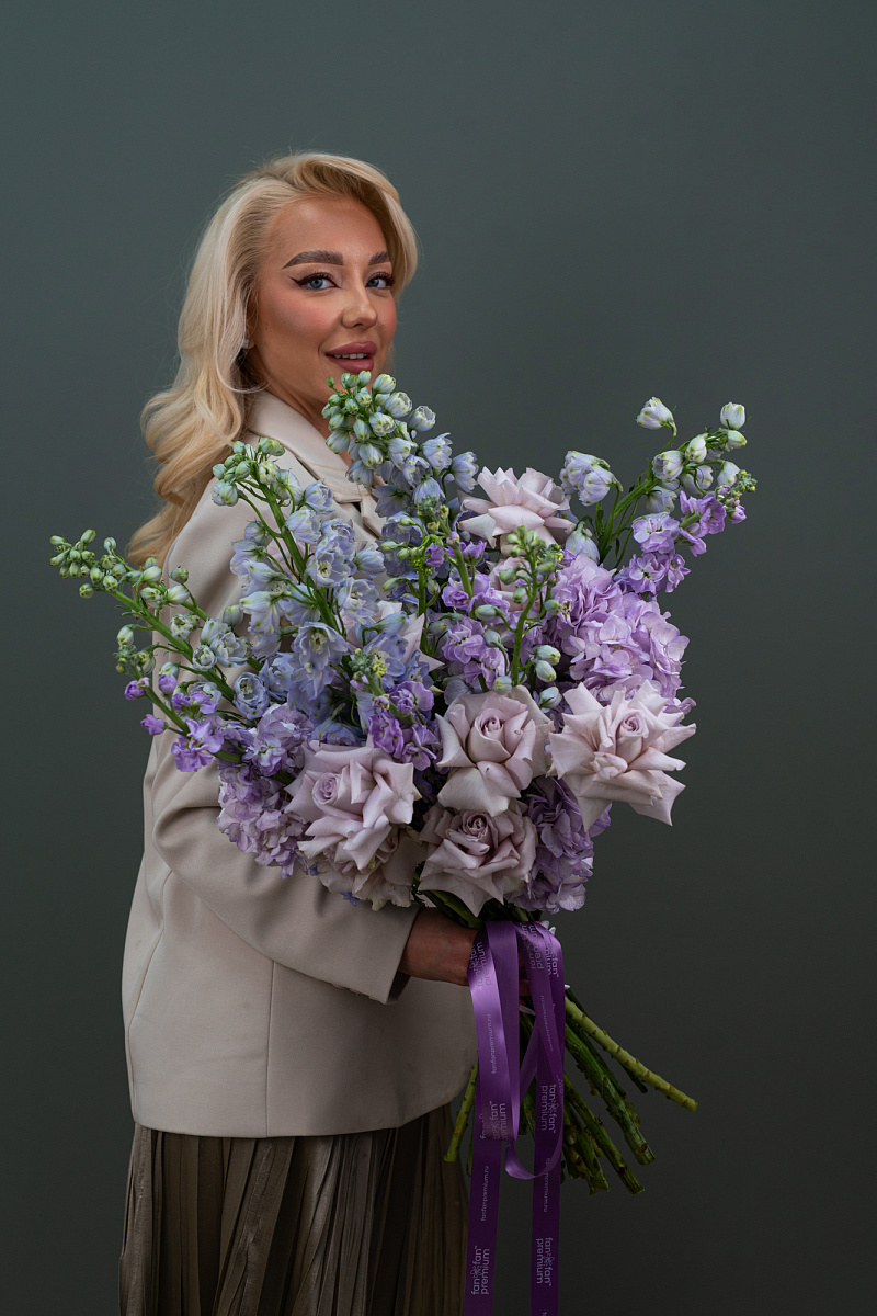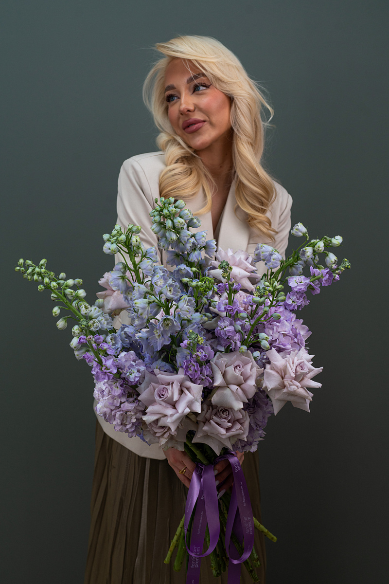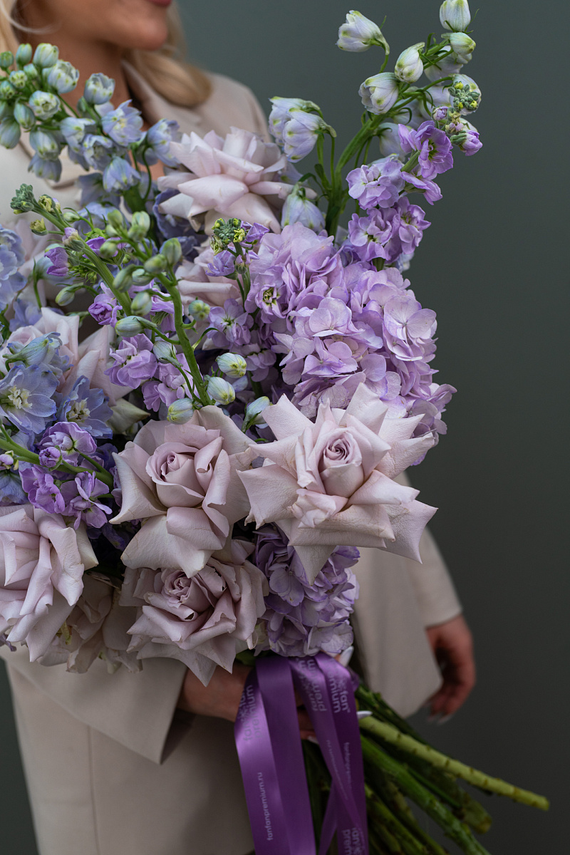 Букет объединяет изящные сиреневые розы, воздушный фиолетовый дельфиниум и ароматные сиреневые матиолы, создавая композицию, полную грациозности и романтики. Нежные цвета вызывают чувство мечтательности и вдохновляют на прекрасные моменты жизни. Идеально подойдет для поздравления женщин, добавления элегантности интерьеру или выражению трепетных чувств.