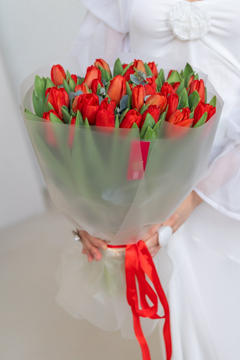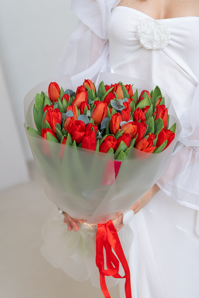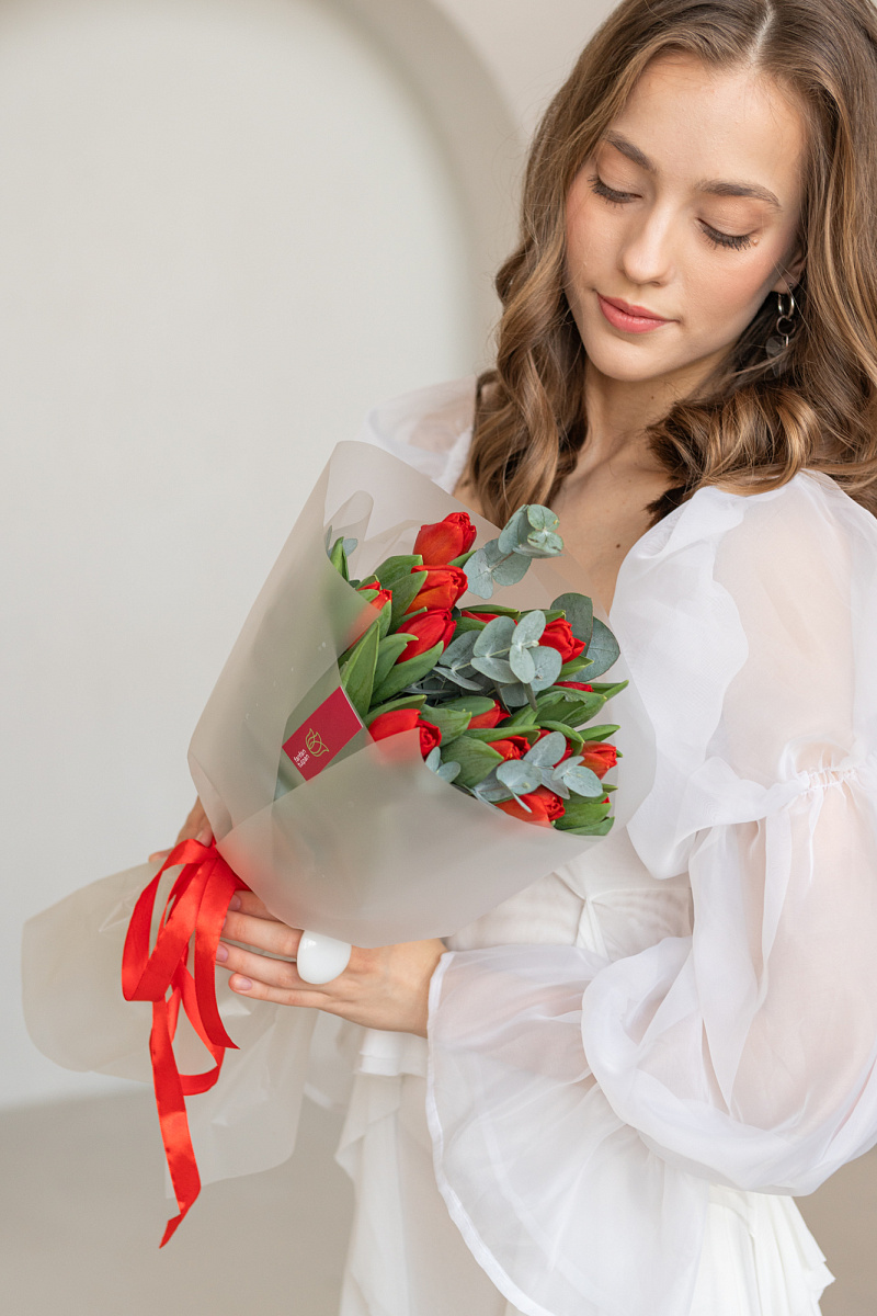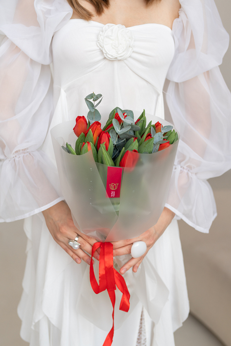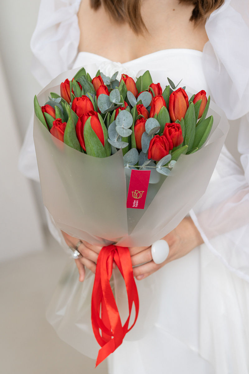 Модная комбинация: яркие красные тюльпаны и лаконичный эвкалипт. Минималистичная геометрия бутонов и мягкая фактура зелени создают актуальный визуальный дуэт. Такой букет станет выразительным акцентом в современном пространстве или стильным знаком внимания без лишних слов.