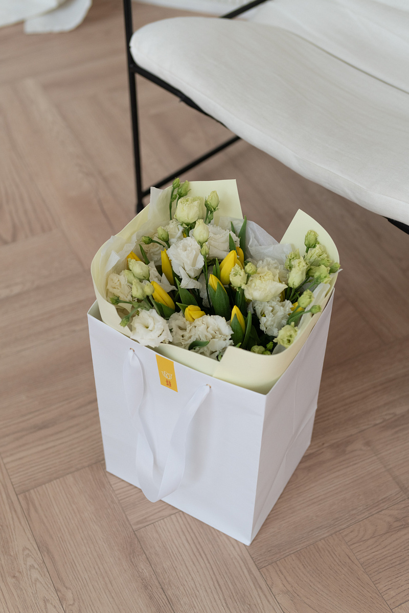 Букет доставляется в фирменном транспортировочном пакете.