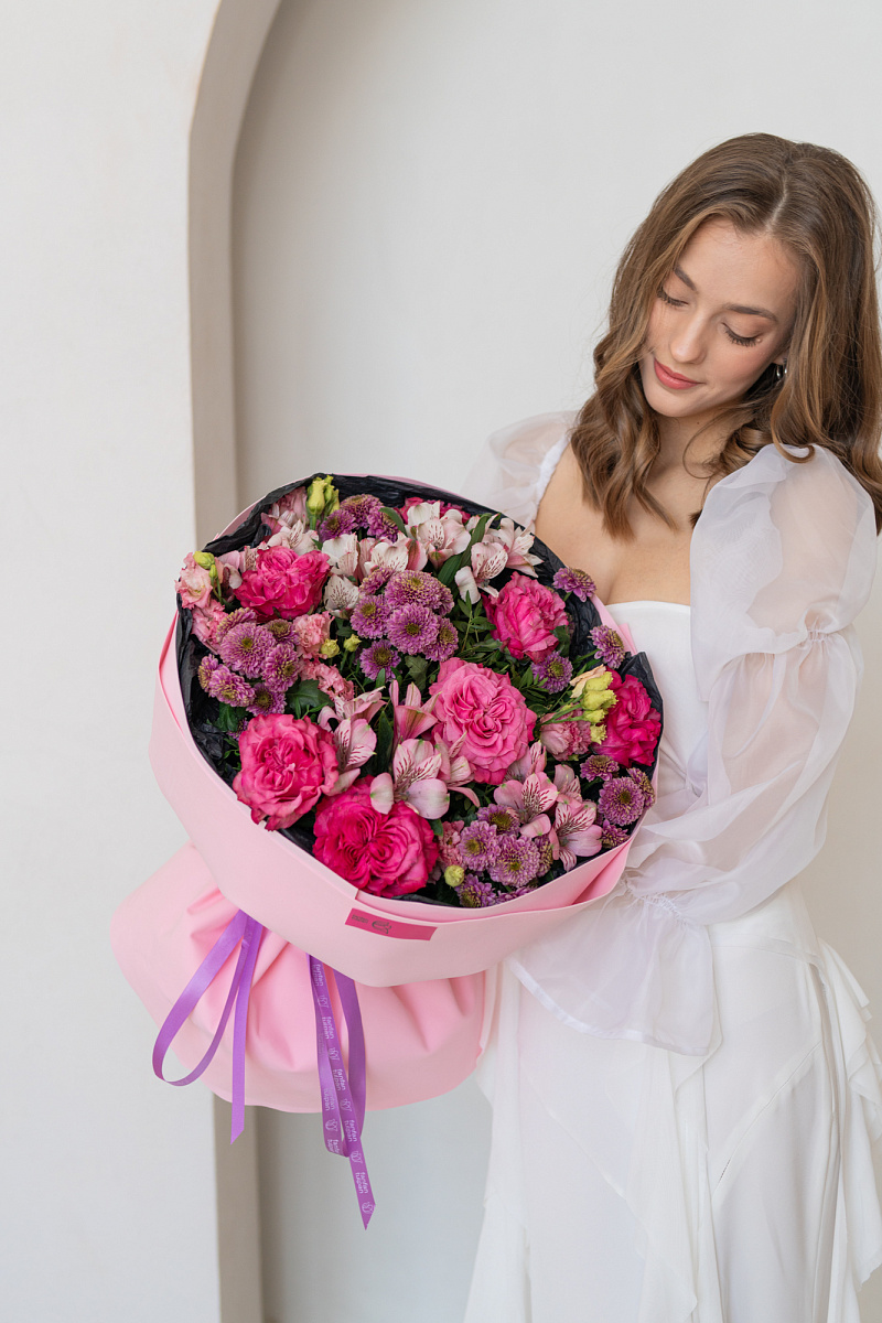 Букет в размере М и L доставляются в Коробке - Трапеции, или в Фирменном пакете, и в Аквабоксе.