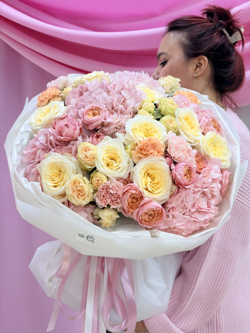 Погрузитесь в океан радости с нашим дофаминовым букетом! Нежные гортензии, словно облака пастельных оттенков, создают ощущение лёгкости и безмятежности. Их пышные соцветия напоминают о тёплых летних днях, прогулках по цветущим садам и мгновениях абсолютного счастья.
