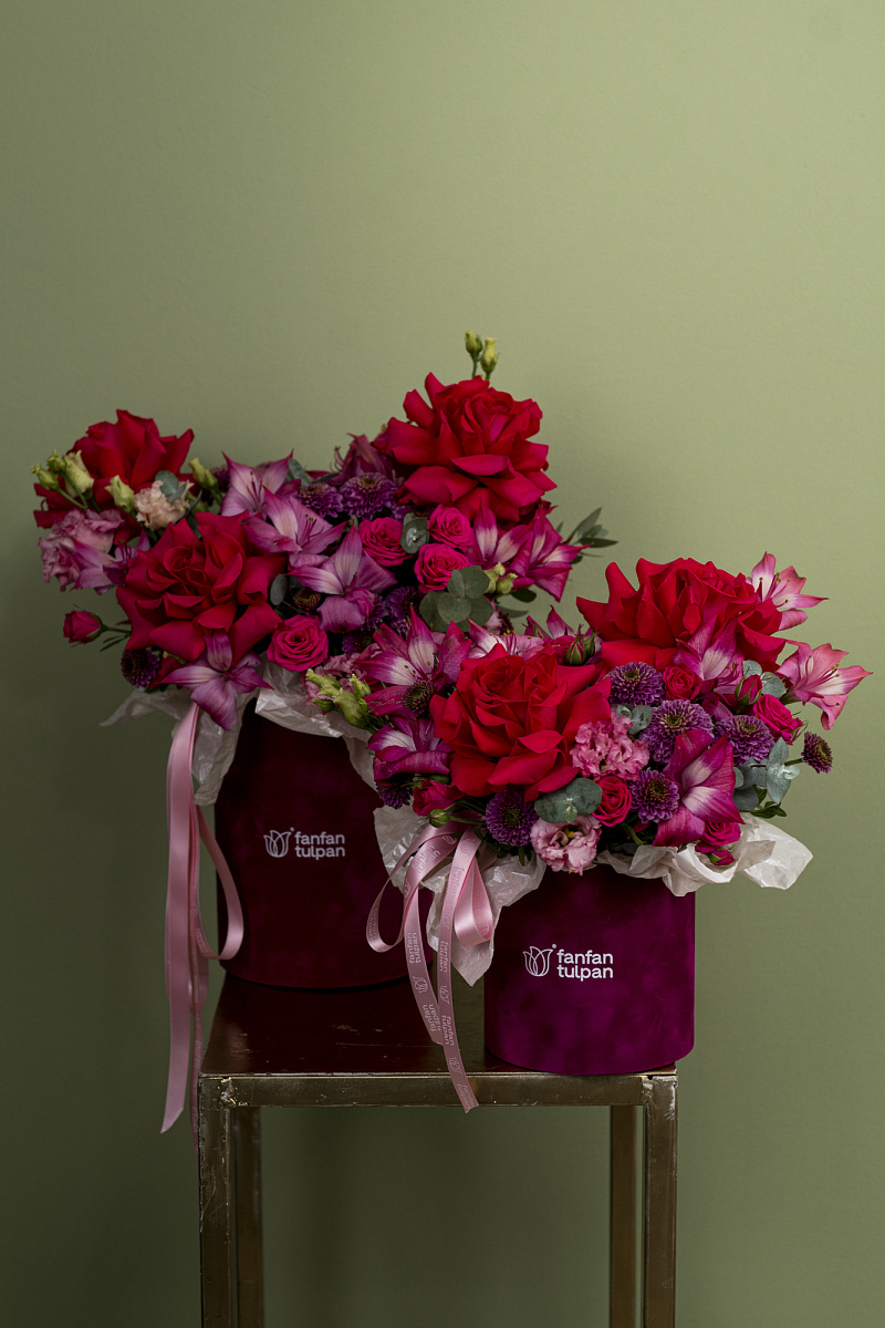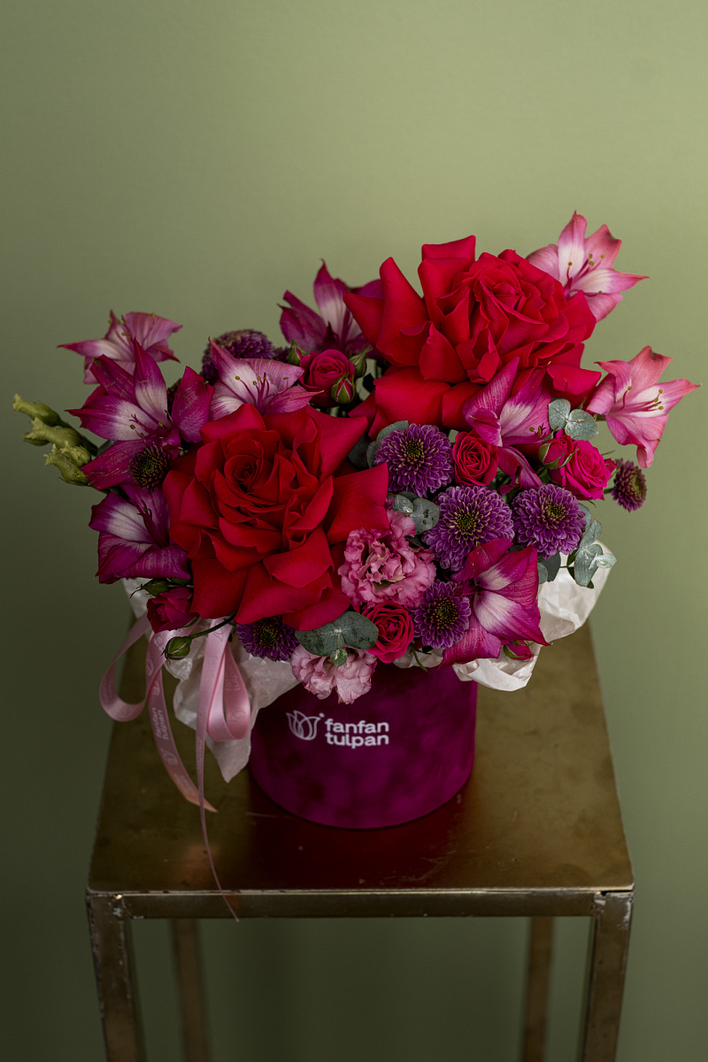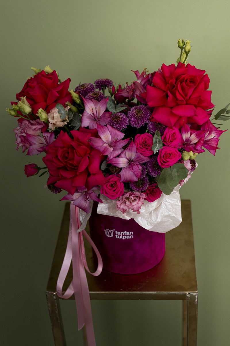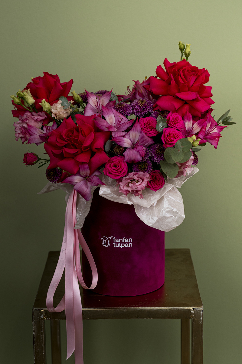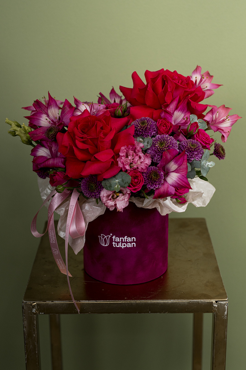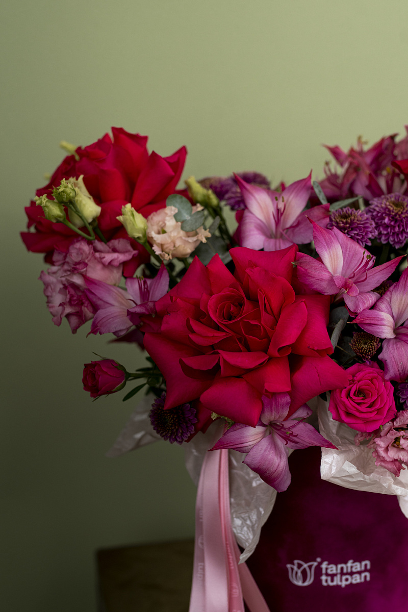 Нежные цветы, необычная форма композиции,нежные оттенки, создают волшебный дуэт с бархатной основой. Розы, альстромерии, хризантемы сантини и нежные соцветия эустомы словно переплетаются в гармоничном танце, наполняя воздух сладким ароматом. Каждый цветок подобран с большой любовью, напоминающей о важности красоты в обыденной жизни. композиция Размера М доставляется в транспортировочной коробке-трапеции.
