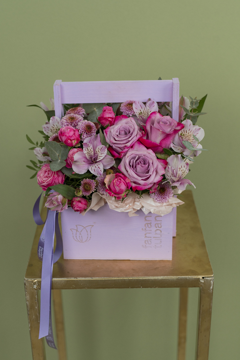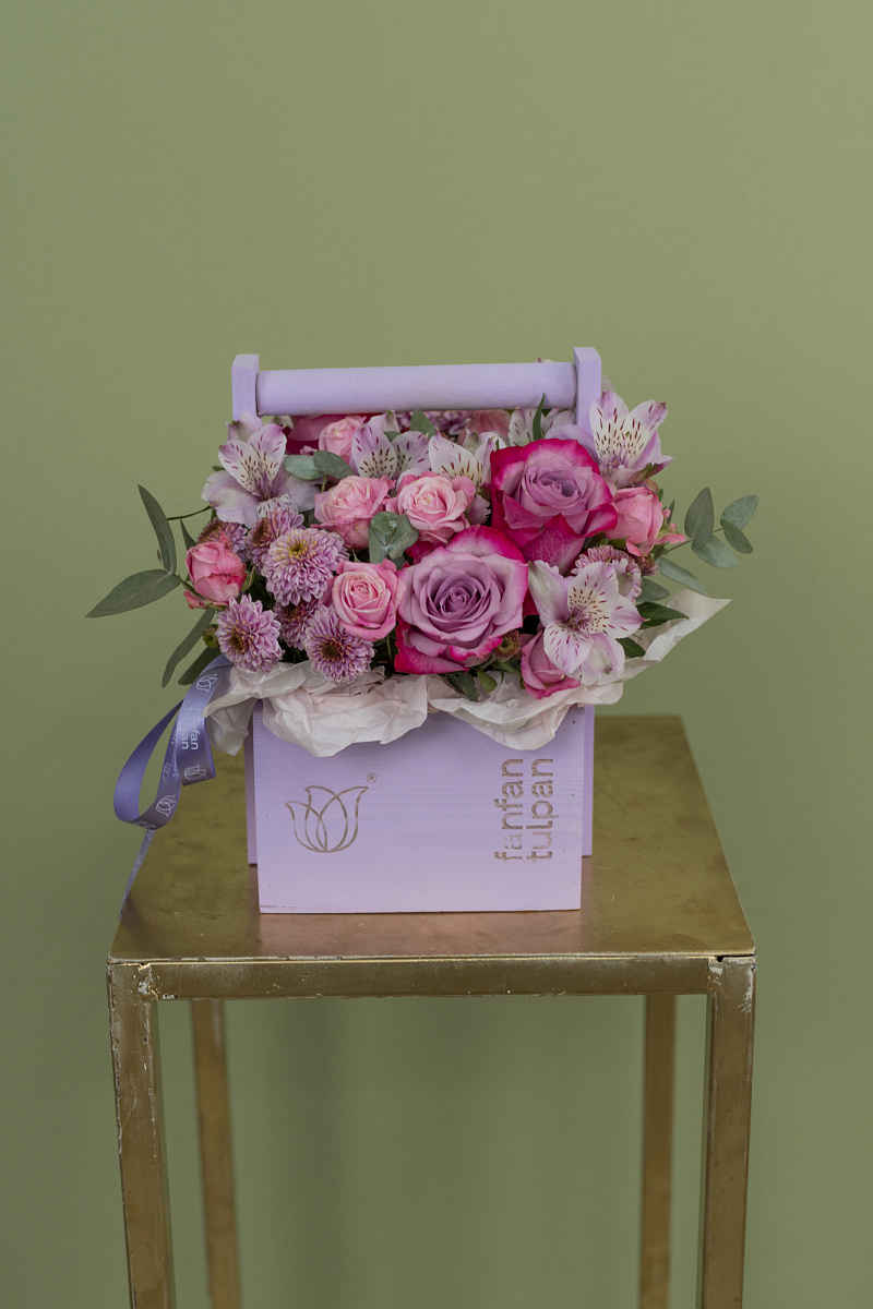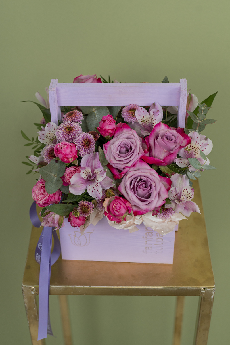 Композиция включает в себя красивые лиловые розы deep purple, которые придают ему загадочности и изысканности. Их глубокий фиолетовый оттенок притягивает внимание и создает особую атмосферу. В композицию также входит прекрасная сиреневая хризантема сантини, дополняющая букет свежими и нежными нотками. Она придает ему легкости и воздушности, добавляя изящество и грацию. Наконец, кустовая роза, украшая данную композицию, придает ей еще больше роскоши и элегантности.