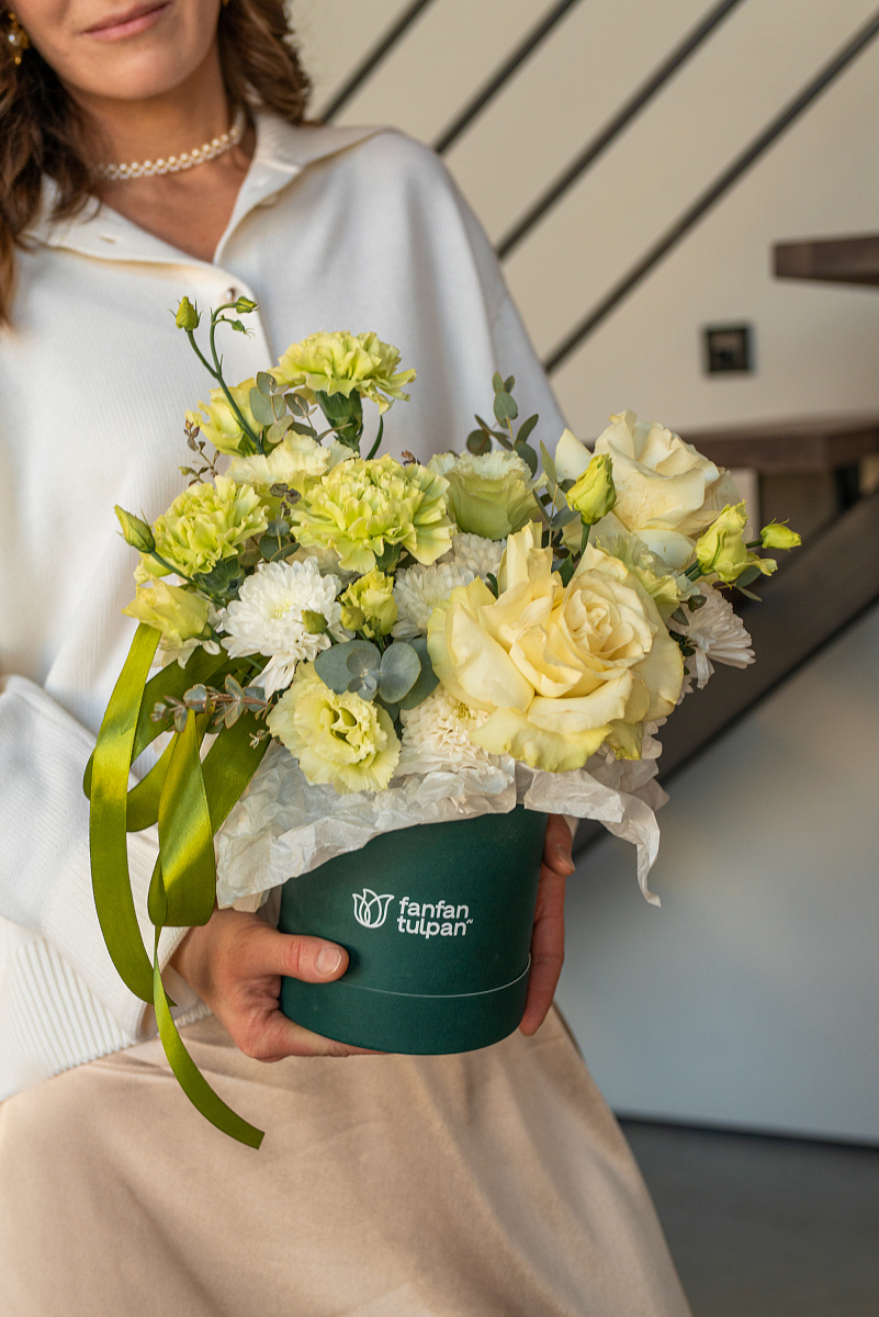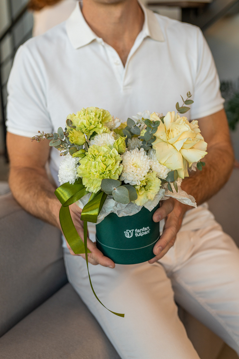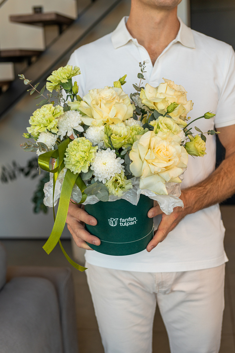Элегантная композиция в стильной коробке — это современный флористический шедевр, где гармония форм, оттенков и текстур создаёт неповторимое впечатление.
