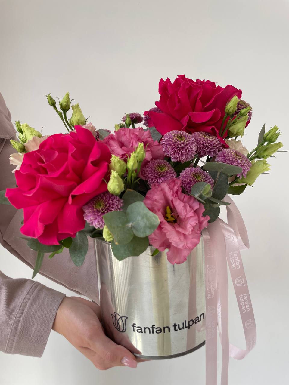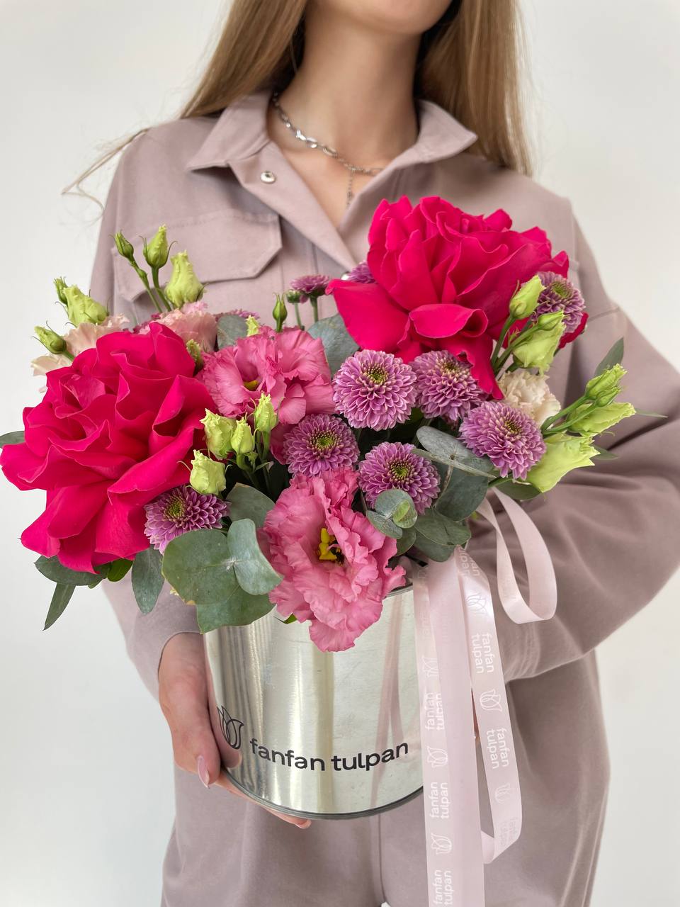 Цветочная композиция из изысканных роз и нежных розовых эустом создает уникальную гармонию природы и стиля.