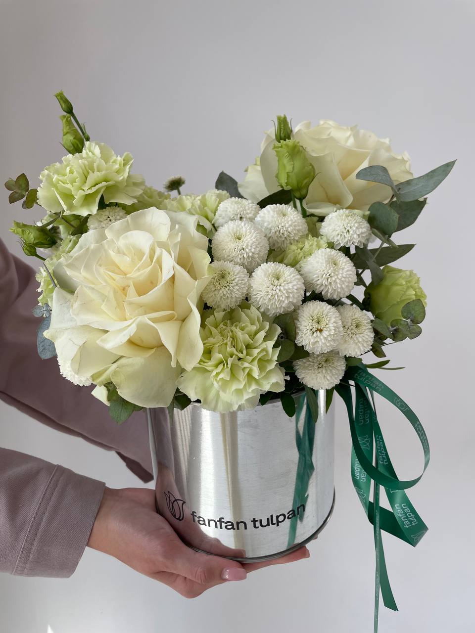Цветочная композиция из роскошных роз и лаймовых гвоздик представляет собой удивительное сочетание элегантности и природной красоты.