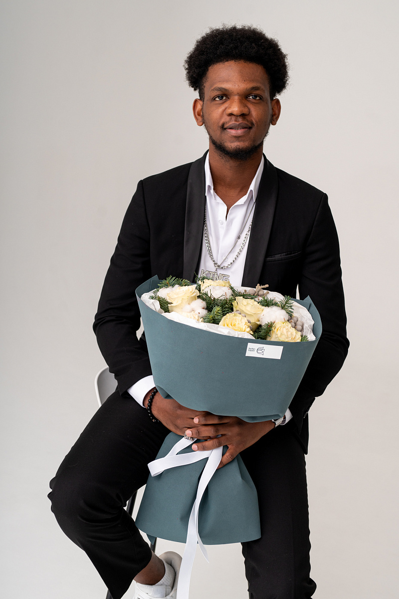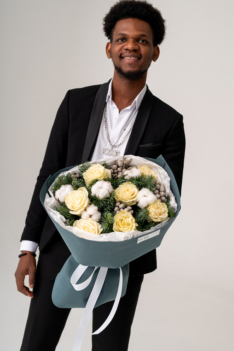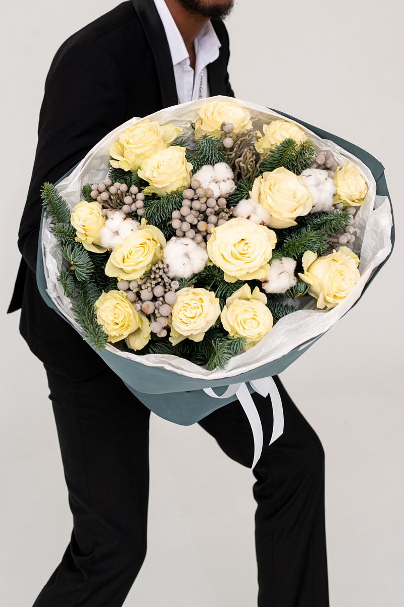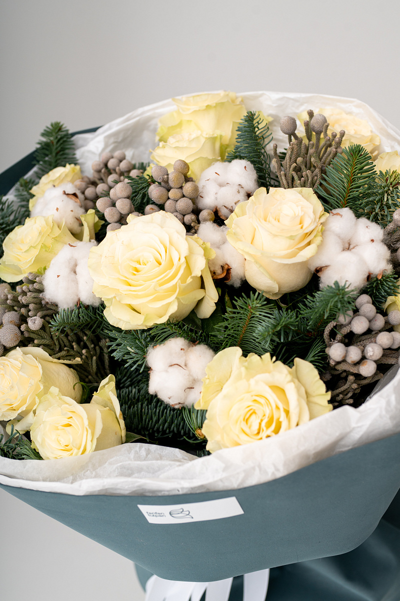 Новогодний букет из нобилиса, роз и хлопка — это стильное и ароматное украшение, которое создаёт атмосферу праздника. Такие композиции сочетают в себе благородную хвою нобилиса и мягкие коробочки хлопка, дополненные декоративными элементами.