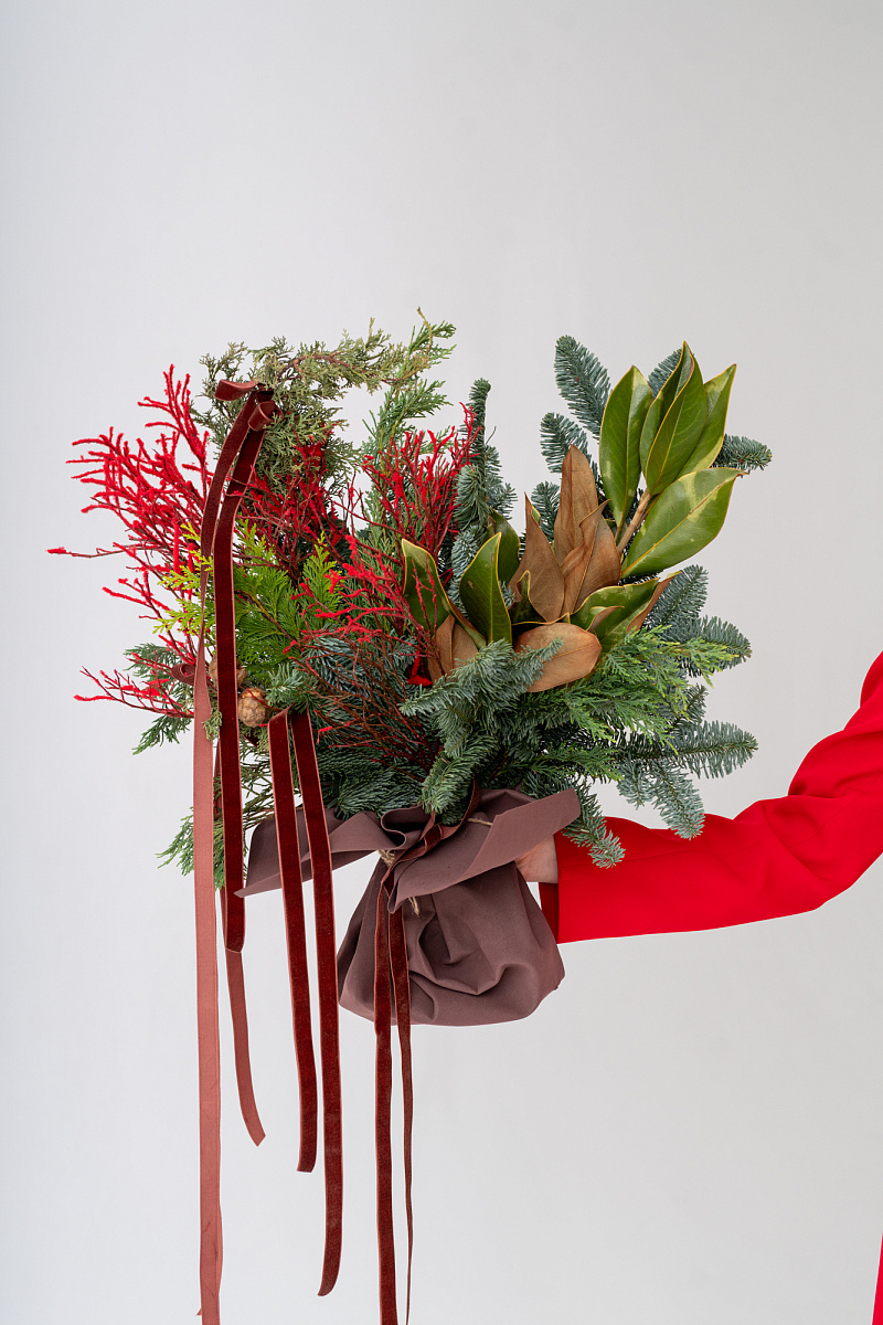 Новогодний букет из нобилиса и туи — это стильное и ароматное украшение, которое создаёт атмосферу праздника. Такие композиции сочетают в себе благородную хвою нобилиса и плотную структуру туи, дополненные декоративными элементами.