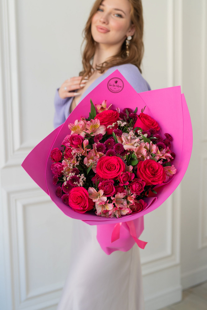 Этот букет из ярко-розовых одиночных роз, кустовых роз и хризантем сантини является прекрасным подарком для неповторимого события или просто для заявления о любви и восхищении. Его чарующий аромат и нежные оттенки розового цвета создают атмосферу нежности и романтики, только усиливаются привлекательностью кустовых роз и хризантем.