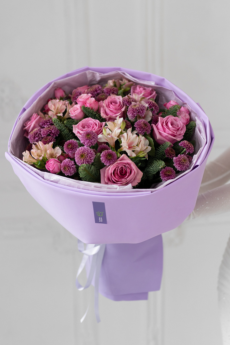Сиреневые цветы, благодаря своей нежной лавандовой окраске, придают букету особый шарм и романтичность.